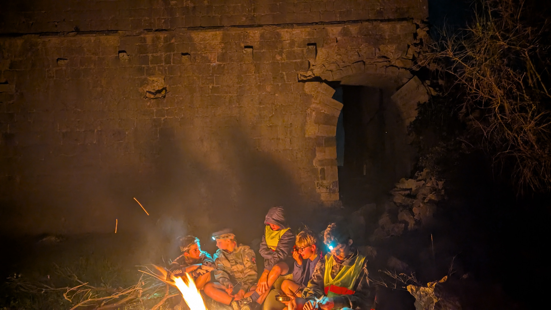 Nous partîmes à 11h30 du stade Mayol, direction le châteauCastellas de Forcalqueiret où nous bivouaquerons. Nous nous relayons pour porter deux carrioles chargées de toutes nos affaires.Nous devons parcourir 40km en une journée. Cela semble bien simple à condition de n'avoir aucun problème et d'être bien équipés. C'était sans compter sur le dérailleur de Foucauld qui a lâché après le déjeuner. Il a fallu attendre qu'il soit remplacé par un autre vélo pour repartir. Nous en profitons pour prendre le goûter. Quelques kilomètres plus loin un pneu de la carriole crève, nous décourageant un peu. Le pneu réparé, nous repartons pour une longue et interminable montée afin d'atteindre une route menant à Forcalqueiret. Chacun ayant un rythme différent, nous nous attendons à plusieurs reprises pour ne pas nous perdre. Arrivés en haut d'un col, nous ne trouvons point l'un des nôtres qui était parti en avant. La nuit et le froid arrivent, nous nous armons de lumières et mettons des affaires chaudes. Pour arriver au village de Forcalqueiret une descente nous attend pour notre plus grande joie, et nous retrouvons notre frère scout à mi-pente, frigorifié et terrifié. Il nous explique qu'il nous attendait depuis trois quart d'heure et s'était imaginé toutes sortes de d'idées. Nous nous ravitaillons en eau sur la place du village puis prenons le chemin menant au château. Une fois arrivé aux ruines mythiques, nous allumons un feu et préparons notre dîner. Les flammes projettent nos ombres sur les tours effondrées qui nous encerclent. Nous couchons nos sacs de couchage dans ce qui devait être jadis le donjon. Aujourd'hui, ce sont les étoiles qui montent la garde de cette antique forteresse.